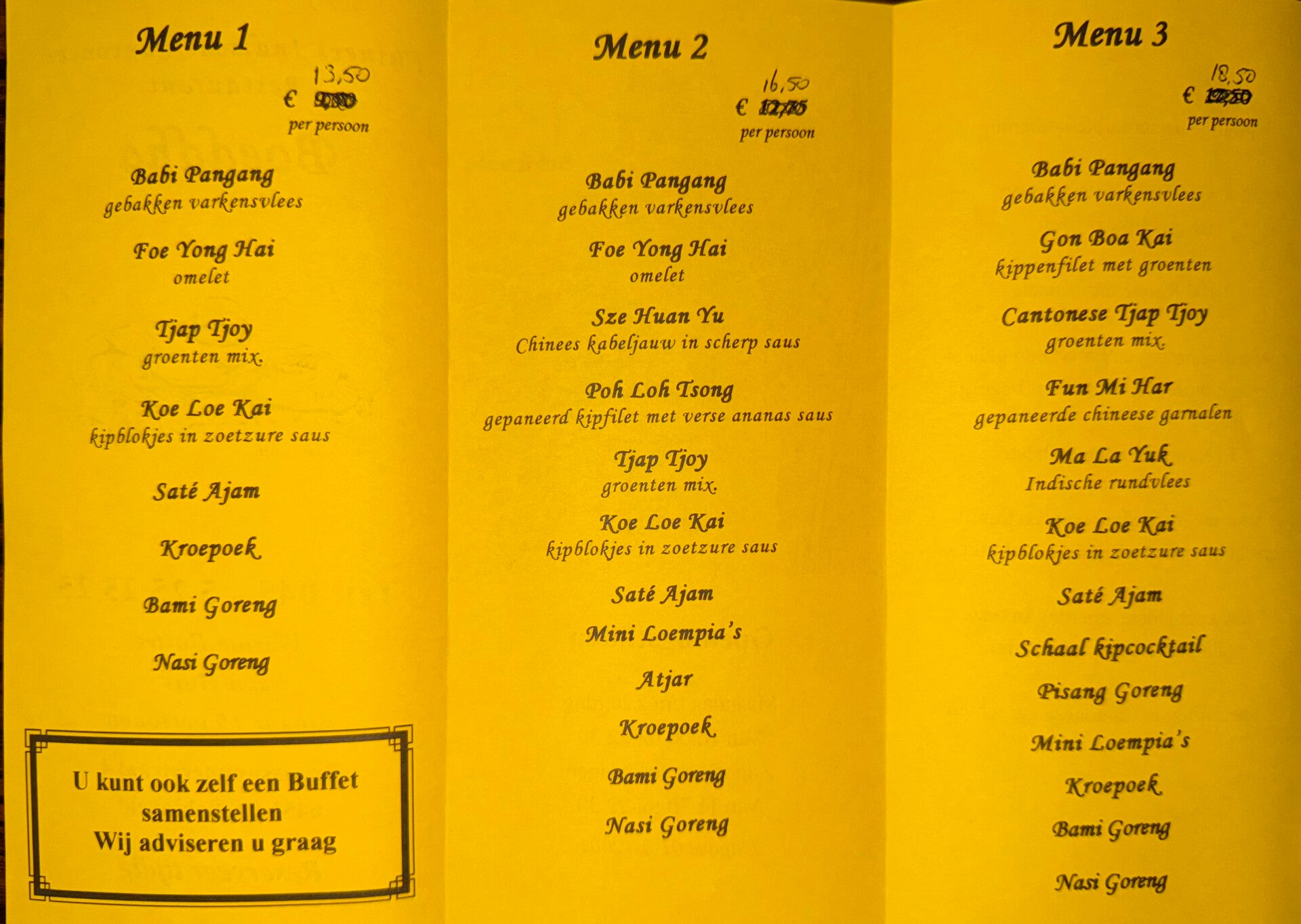 Ook is het mogelijk om catering te verzorgen vanaf 15 personen. Zie hieronder onze menu’s; het is tevens mogelijk om in overleg zelf een menu samen te stellen. Voor meer informatie kunt u langskomen of telefonisch contact met ons opnemen.